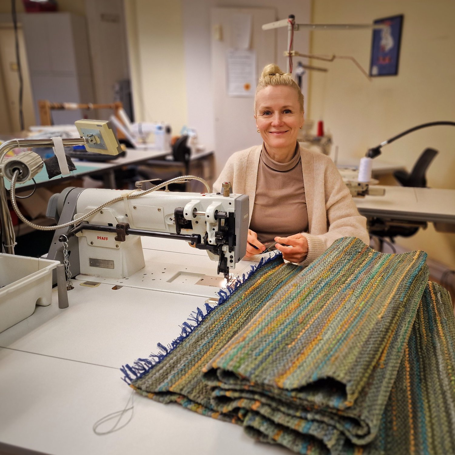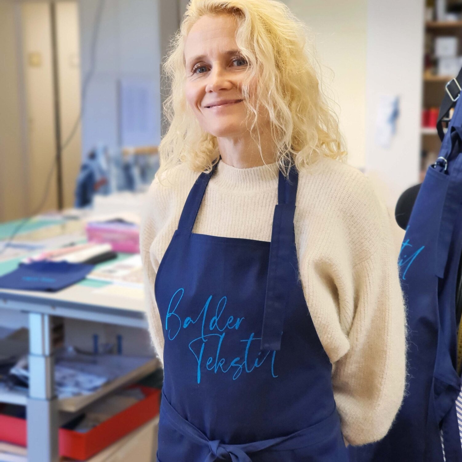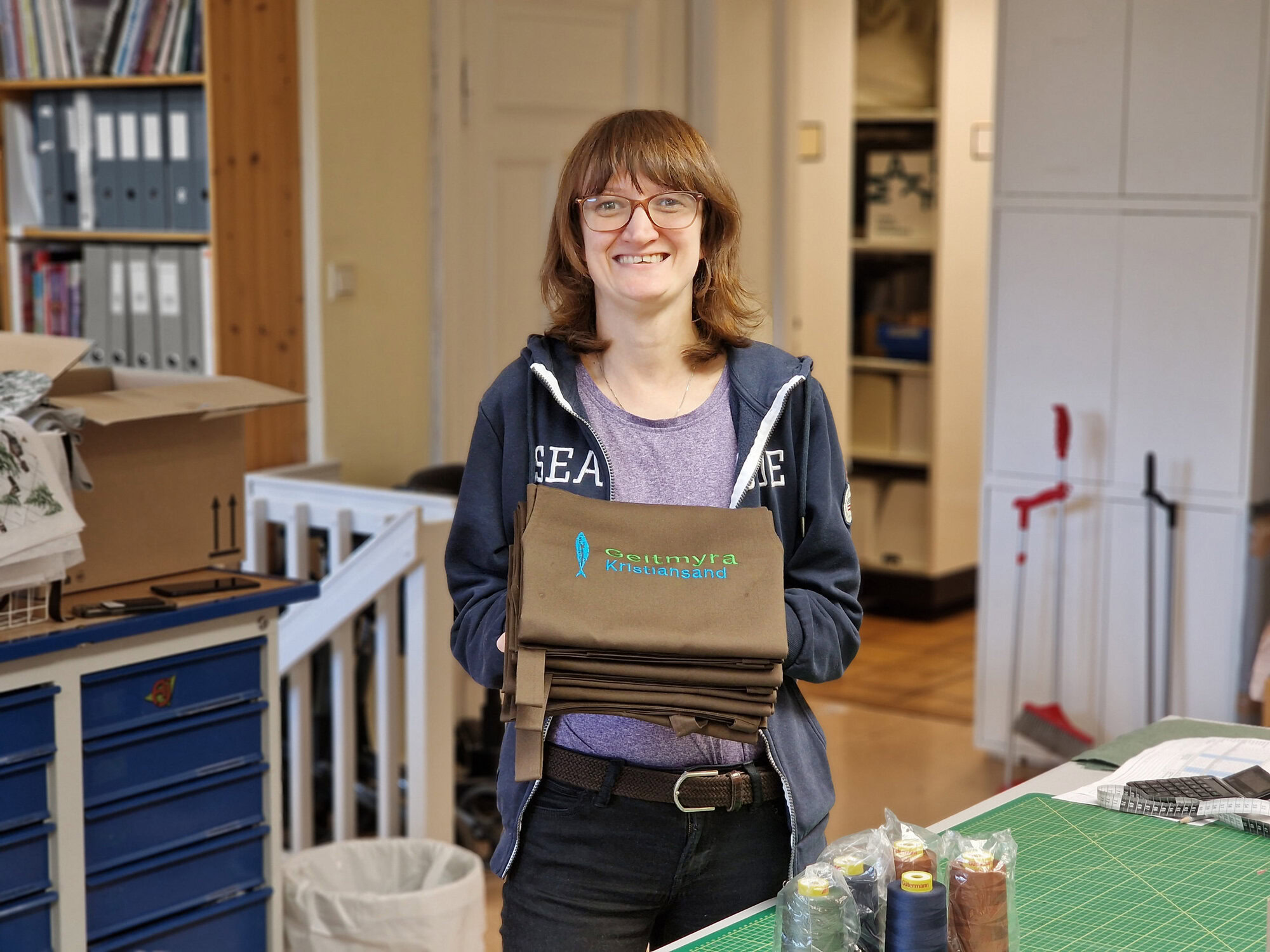 Her produserer vi varer som selges i butikken vår. Vi har et hyggelig, moderne tekstilverksted med alt vi trenger for å sy, brodere, klippe og presse – fra industrisymaskiner til overlock og broderimaskin.