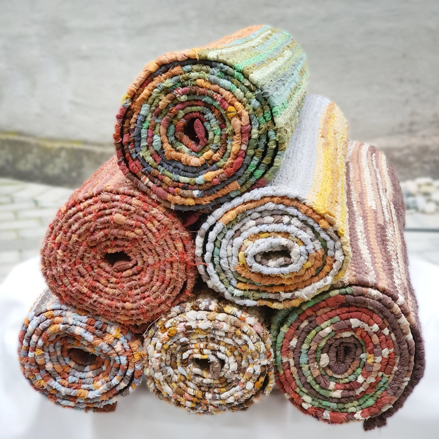 Vår produksjon er basert på gjenbruk. Alle er våre ryer er vevet av brukte bomulls tekstiler med renning i solid bomullsgarn. Vi vever veldig gjerne filleryer på bestilling. Bredder, lengder og farger blir da tilpasset dine spesielle ønsker. Vi kan "matche" opp mot dine veggfarger, gardinene dine eller annet du måtte ønske.